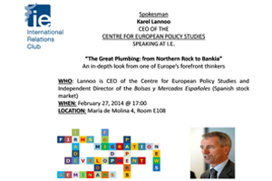 Feb 27, 2014. IE International Relations Club: Curious in learning about the banking crisis in the Eurozone? Interested in learning what the EU's reaction has been to resolve it? Are their policies effective? Where is the Eurozone heading? Come have all your questions answered by our guest lecturer Karel Lannoo, CEO of the Centre for European Policy Studies, one of Europe's most important think-tanks and Independent Director of the Bolsas Y Mercados de Espana. |