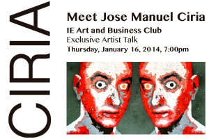 | Jan 16, 2014. IE Arts & Business Club: IE Arts and Business club is excited to invite you to a special artist talk with Jose Manuel Ciria. This is a rare opportunity to meet an internationally recognized artist for an exclusive, private talk for IE students. The event will take place at his studio in Madrid, and is limited to 15 people. Cost is 5€. Address will be provided once you register. We expect every member who registers for this event to be respectful of our club and your classmates – if you sign up, please attend. |